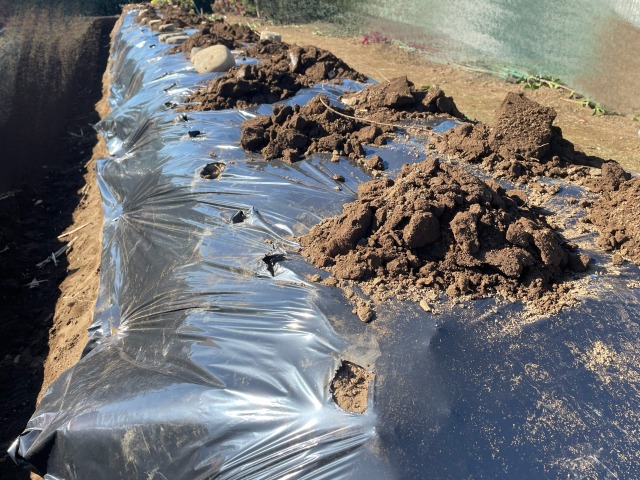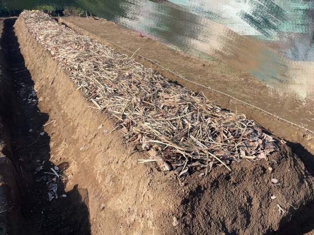 あとは2〜3ヶ月、菌ちゃんがきてくれるのを待ちます。寒いと菌ちゃんが活動しないので、低温期の12〜2月はカウントしません。5月に植えつけをしたい場合は、2月までには畝づくりを終わらせておくとよいです。