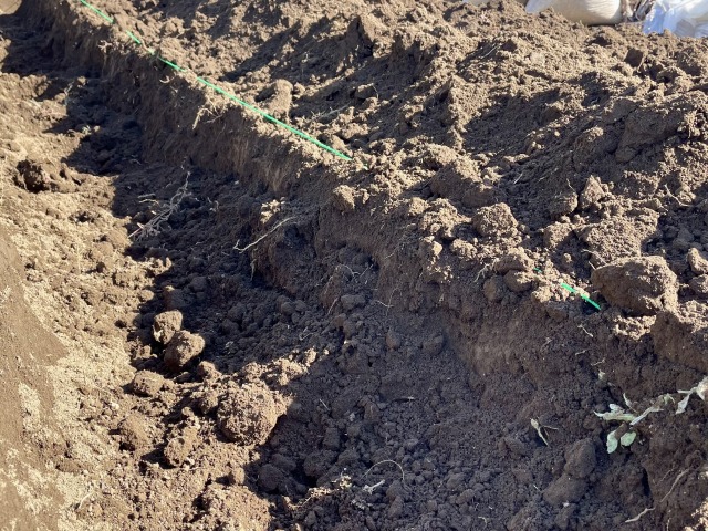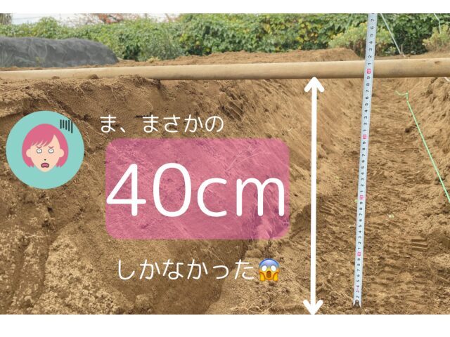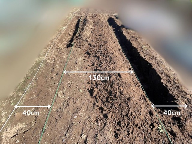 12mの畝全てを台形に整えてから高さを計測したら高さが40cmしかなかったというミスを犯しました。プラス10cmのために再度掘るという手間がかかったので、台形が一部できた時点で高さと幅を測ってみてください。