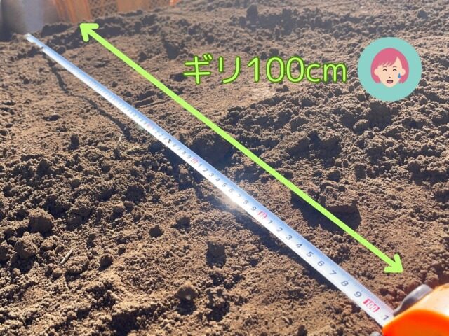 土を被せたあとに畝幅を測ってみたら90cmしかなかったです。成形段階で100cmを確保しておいてよかったです。